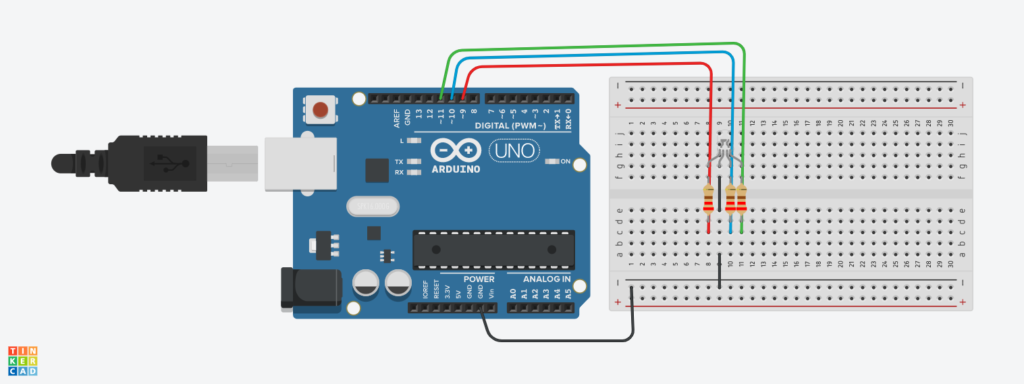analogWrite(9,200); dediğimiz zaman 9 numaralı pini 200 değerine ayarla komutunu göndermiş oluyoruz. Bu da elektriksel olarak yaklaşık 3,92volta denk geliyor. Her br uca muhakkak 220ohm’luk direnç bağlamalyız aksi halde ledlerimiz patlayabilir.